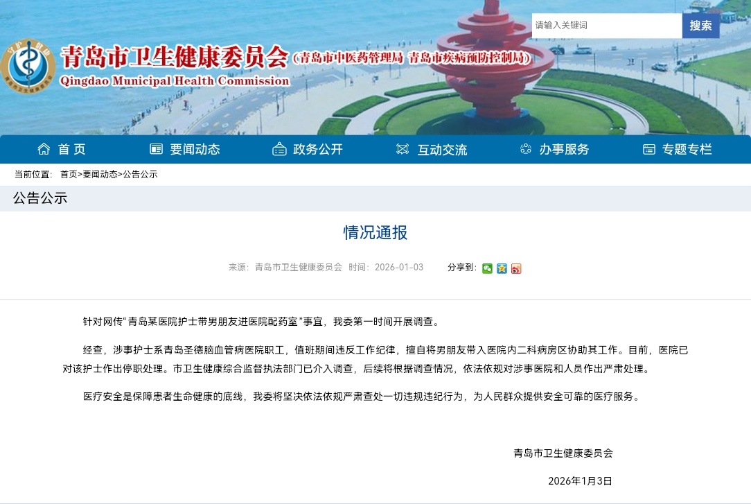 1月3日上午,青岛市卫生健康委员会发布情况通报,针对网传“青岛某医院护士带男朋友进医院配药室”一事,经调查核实后,已对涉事护士作出停职处理。