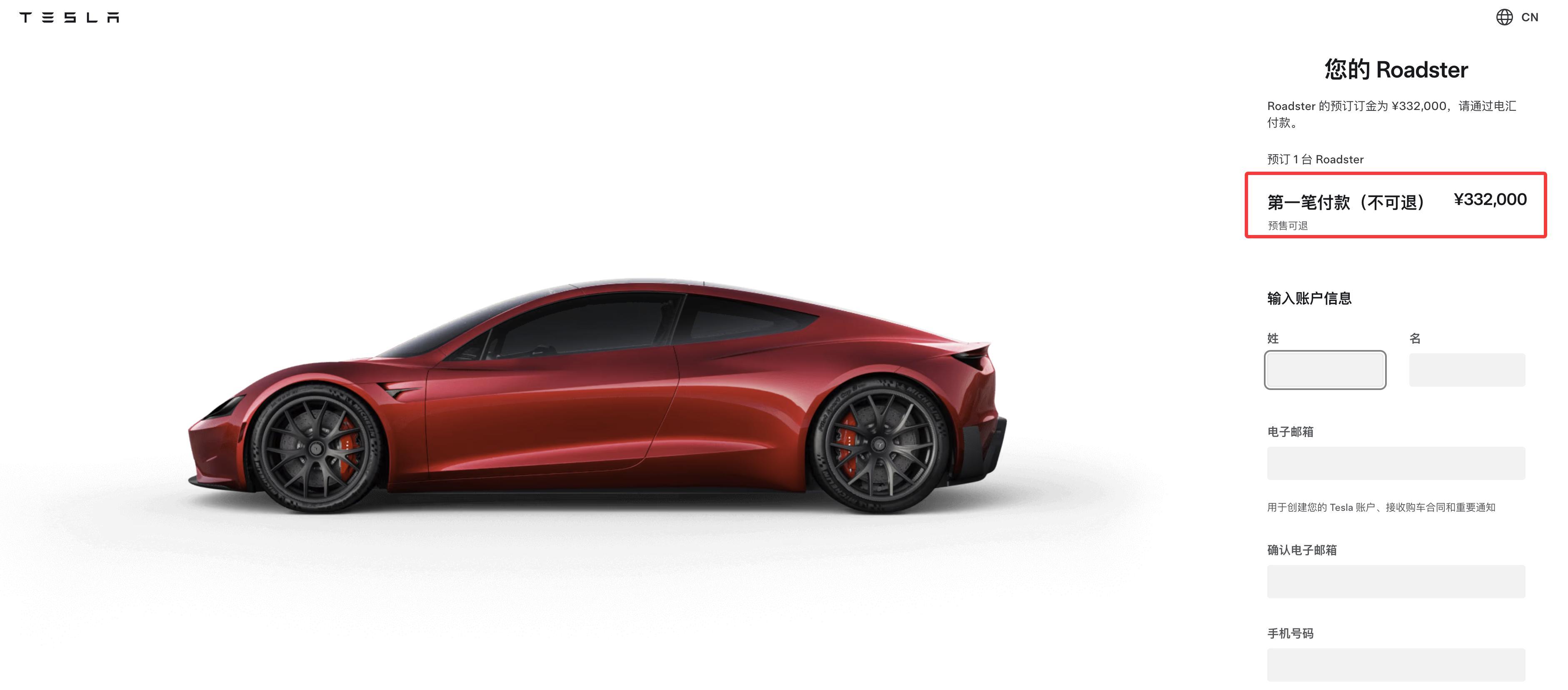 在特斯拉官网上,我们还能找到Roadster的预售界面,订金33.2万元。